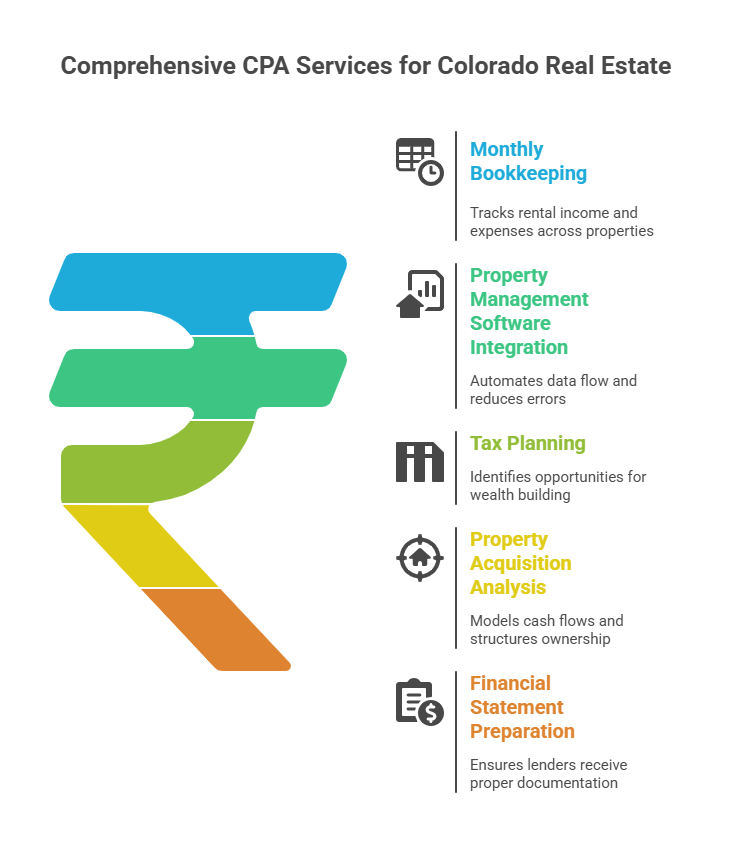 Colorado real estate CPA firms provide specialized services including bookkeeping, tax planning, cost segregation studies, 1031 exchange coordination, passive activity loss tracking, property acquisition analysis, and financial statement preparation. Firms experienced in real estate understand depreciation schedules, rental income reporting, and Colorado-specific tax requirements that general accountants often miss.