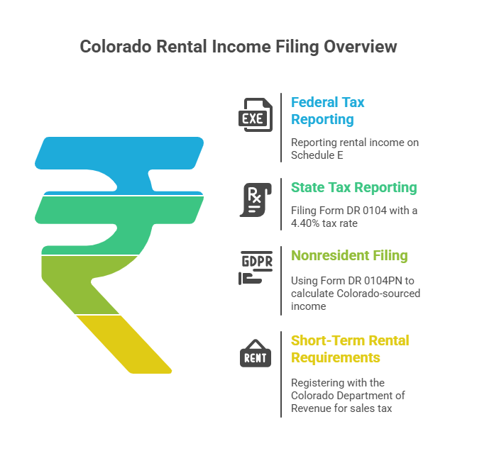 Colorado landlords file federal Schedule E (Form 1040) to report rental income and expenses. For state taxes, file Form DR 0104 (Colorado Individual Income Tax Return). Short-term rental operators (rentals under 30 days) must register with the Colorado Department of Revenue for a sales tax license and file regular returns. Nonresidents file Form DR 0104PN to calculate Colorado-sourced income.