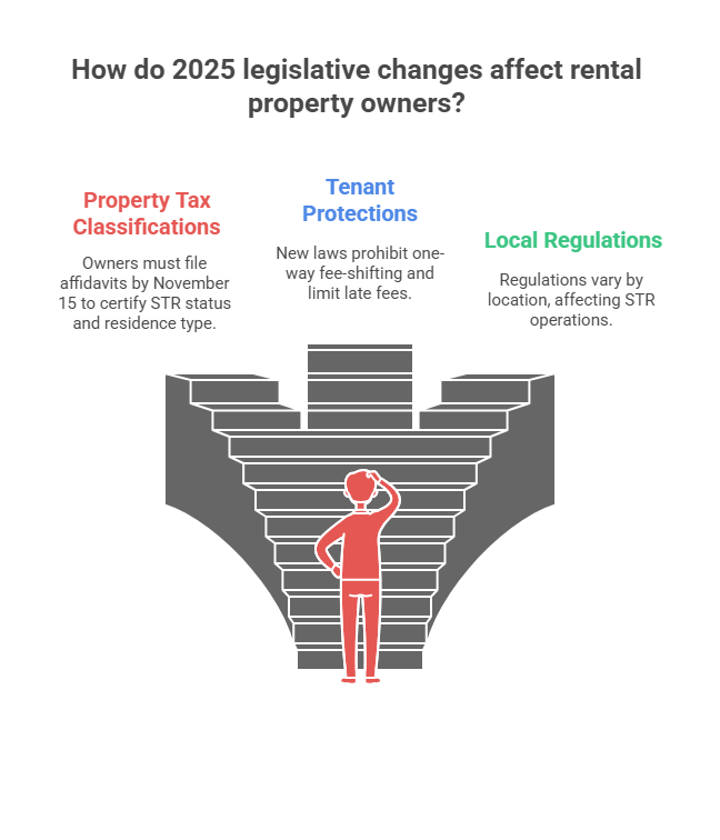 House Bill 24-1299 created new property tax classifications for short-term rentals. Owners must file annual affidavits by November 15 certifying STR status and whether properties are primary or secondary residences. Senate Bill 21-173 strengthened tenant protections, prohibiting one-way fee-shifting and limiting late fees to $50 or 5% of past-due rent. Local regulations evolve rapidly, with Summit County capping licenses, Lakewood requiring primary residence use, and Aspen limiting STRs to 120 days annually.