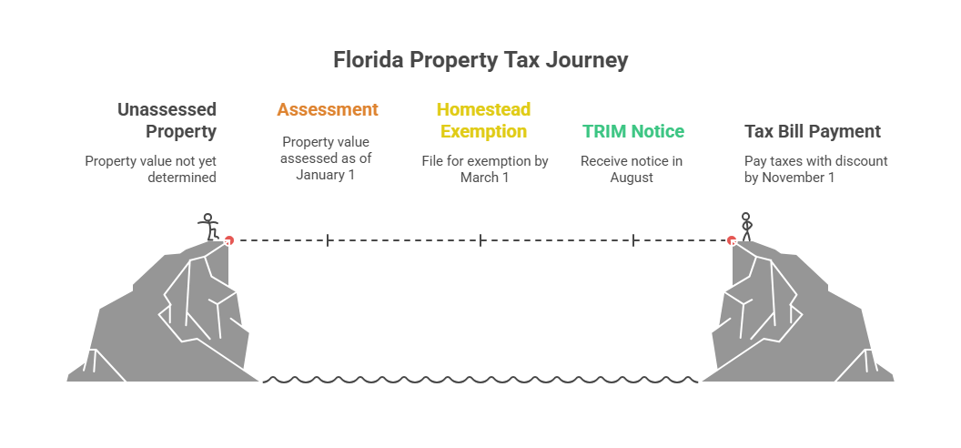 January 1: Assessment date. Property taxes assessed based on January 1 property value and ownership. March 1: Homestead exemption deadline. New exemptions must be filed by March 1 to apply to current year taxes. Homestead exemption reduces taxable value by up to $50,000. August: TRIM notices mailed notifying property owners of assessed values and proposed millage rates. September 18: Value appeal deadline (25 days after TRIM mailing) to file Value Adjustment Board petitions. October: Property appraisers certify final tax rolls to tax collectors. November 1: Tax bills mailed, officially beginning the payment period with 4% discount available.