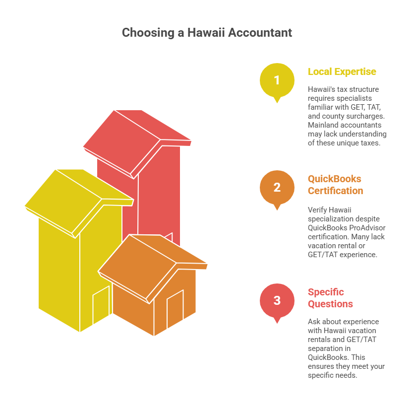QuickBooks ProAdvisor certification indicates platform expertise, but verify Hawaii specialization. Many bookkeepers hold ProAdvisor status without vacation rental or GET/TAT experience. Ask specifically: "How many Hawaii vacation rental clients do you serve?" and "How do you handle GET/TAT separation in QuickBooks?"