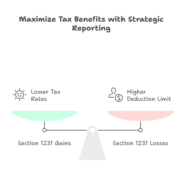 This creates "best of both worlds": gains taxed as capital gains (lower rates), losses deductible as ordinary losses (no $3,000 limitation). The IRS closely examines these transactions during audits because tax benefits are substantial.
