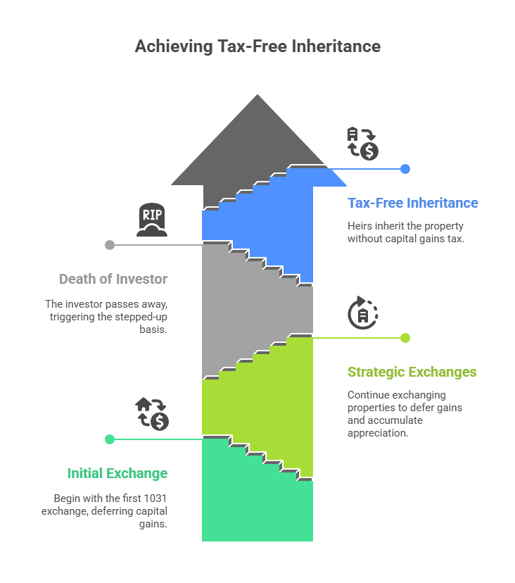 When you finally sell replacement property without another 1031 exchange, all deferred gains become taxable, including the original New York property gain plus subsequent appreciation. Strategic investors continue exchanging until death. The stepped-up basis at death eliminates deferred capital gains for heirs, permanently avoiding taxation through this "swap 'til you drop" strategy.