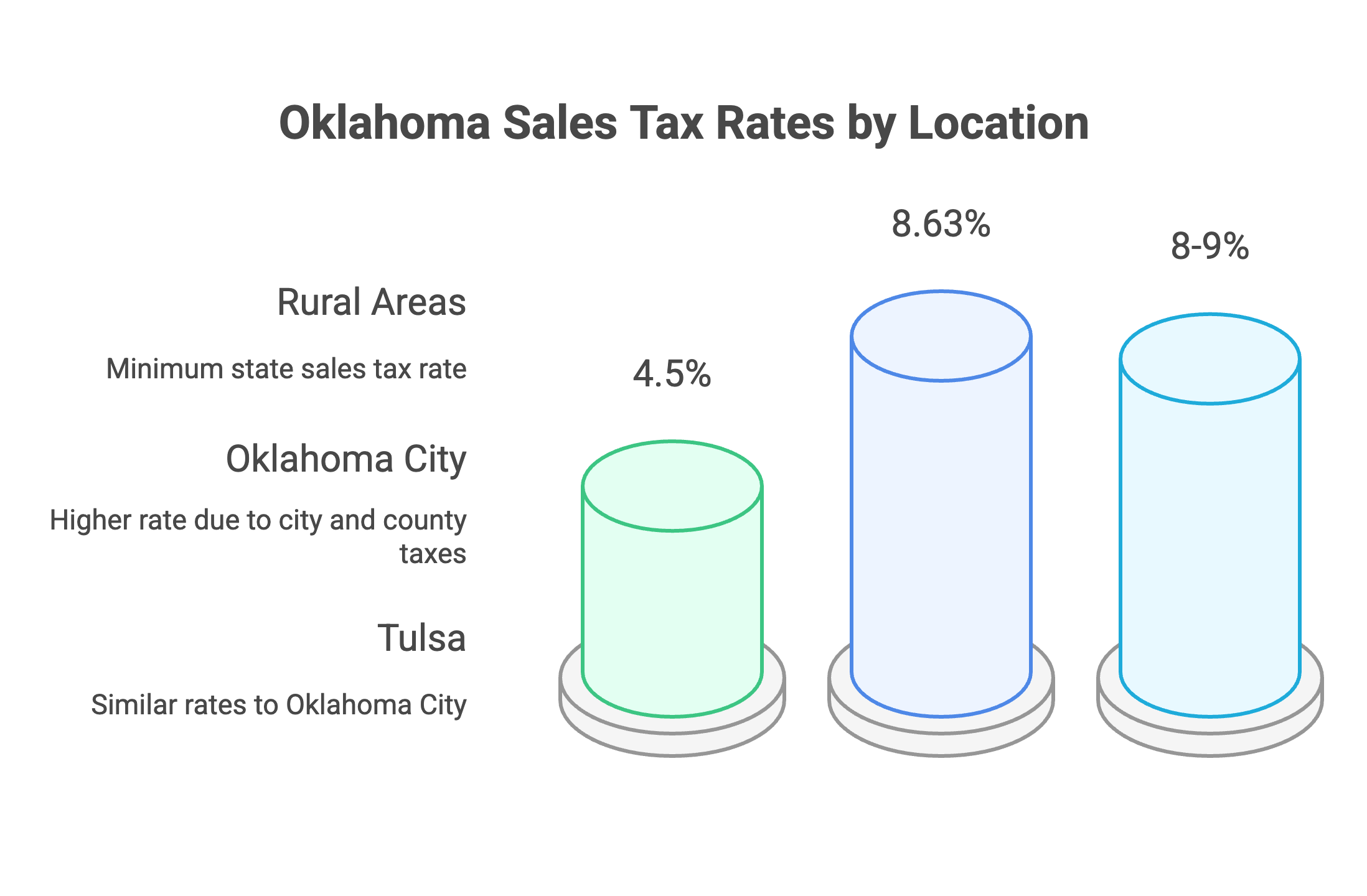 Major metropolitan areas typically see higher combined rates due to city and county taxes. Oklahoma City, for example, reaches 8.63% with its combination of state, county, and city taxes. Tulsa sees similar rates in the 8-9% range, while rural areas might have rates closer to the 4.5% state minimum.