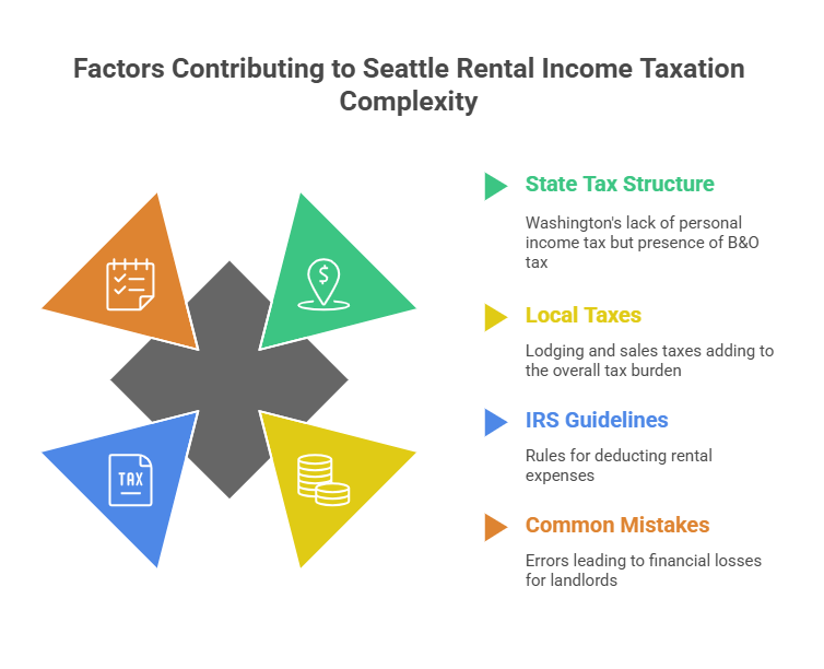 Rental income taxation in Seattle is uniquely complex. Washington State has no personal income tax, but short-term rental operators face B&O tax on gross income, plus lodging and sales tax requirements totaling 15-18%. According to IRS Publication 527, landlords can deduct "ordinary and necessary" rental expenses, but knowing which qualify requires expertise.