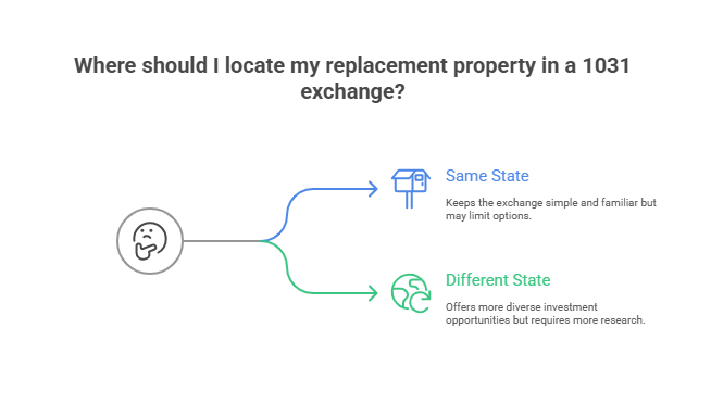 The IRS allows 1031 exchanges across state lines without restriction. Your relinquished property can be located anywhere in the United States, and your replacement property can be in any other U.S. state. The properties must be like-kind (real property for real property), held for investment or business use, and equal or greater in value to defer all capital gains taxes federally.