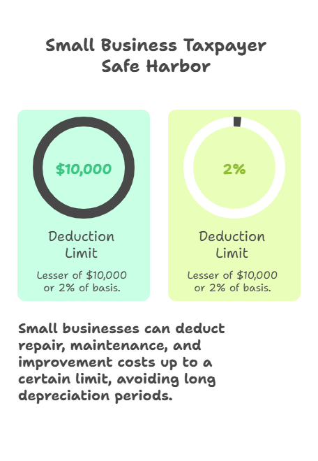 The regulations include a special safe harbor for small business taxpayers. Qualifying taxpayers can deduct amounts for repairs, maintenance, and improvements if totals don't exceed the lesser of $10,000 or 2% of building's unadjusted basis.