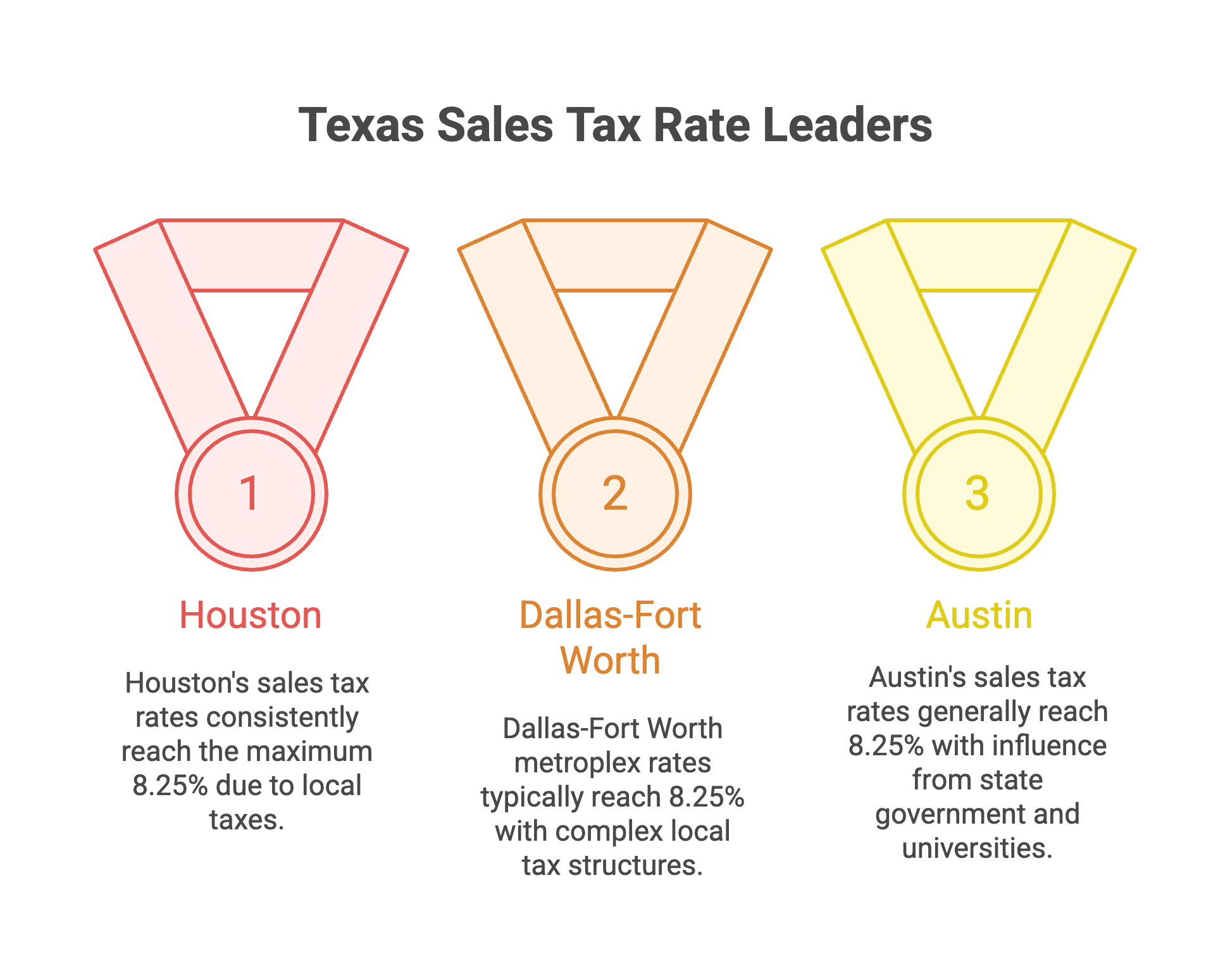 Dallas-Fort Worth metroplex rates also typically reach 8.25% in most major cities, though some smaller suburban communities may have lower rates. The complexity increases because the metroplex spans multiple counties, each with different local tax structures.