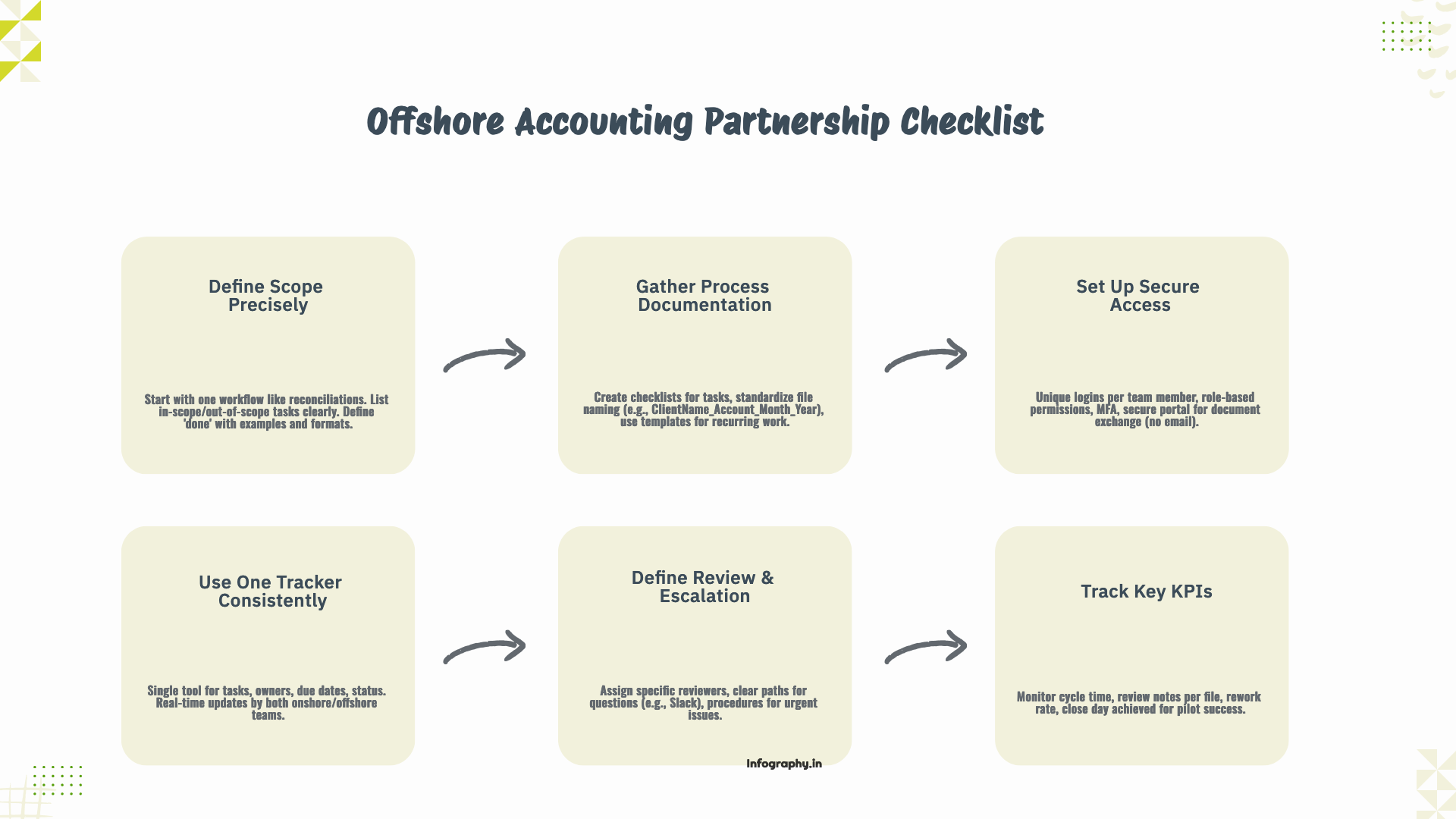 A practical kickoff checklist for CPA firms starting an offshore accounting partnership: scope, SOPs, access, KPIs, communication, and a pilot plan.